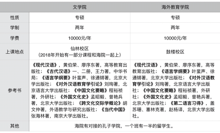 南大最初只在海外教育学院设立了汉语国际教育专业,时间是2009年。2013年开始分两个院授课--文学院和海外教育学院,我列个表格简单谈一下区别。