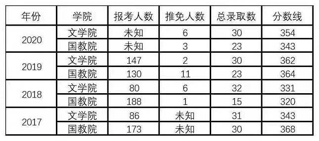 2021年文学院推免人数5,进面人数34,录取人数29,分数线358。