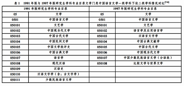 在1997年之前,“对外汉语教学”一般设置在文学门类中国语言文学类的二级学科“汉语文字学”/“现代汉语”之下,或者外国语言文学类的“英语”/“英语语言文学”二级学科之下。在1997年教育部颁布的《授予博士、硕士学位和培养研究生的学科、专业目录》中,“现代汉语”“汉语史”和“汉语文字学”合并成为一级学科中国语言文学之下的二级学科“汉语言文字学”;“语言学”变成了二级学科“语言学及应用语言学”(参见表1)。自此开始,一些高校开始在这两个二级学科下面设立“对外汉语教学”专业方向,培养学术型硕士研究生。也就是说,直到此时,“对外汉语教学”这个名称并没有在研究生学科专业目录里出现过。