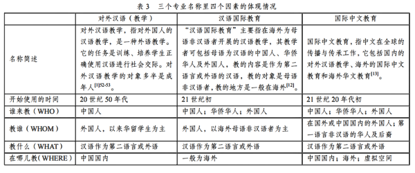 纵观国际中文教育学科的发展、成长历程,其学科内涵经历了两次大的拓展和升级。第二语言教学或外语教学一般涉及教者、学习者、教学内容、教学环境等要素,即“谁来教”“教谁”“教什么”和“在哪教”[12],我们可以从以上四个因素来分析一下“对外汉语教学”“汉语国际教育”“国际中文教育”三个学科名称的异同(参见表3)。