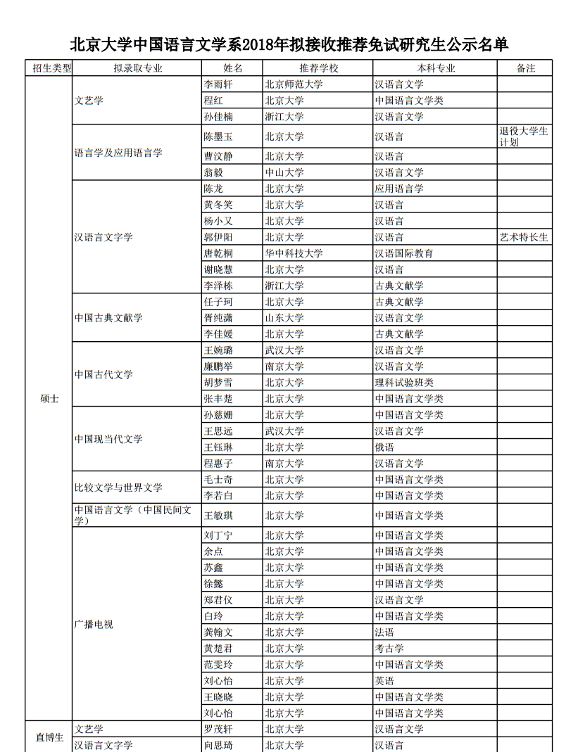 > 北京大学中文系2018年拟接收推免研究生公示名单