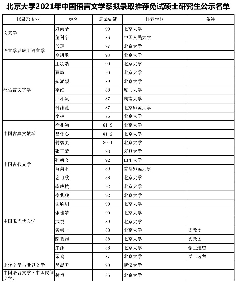 经北京大学研究生院审核,中文系2021年接收推荐免试研究生拟录取名单见附件1和附件2。