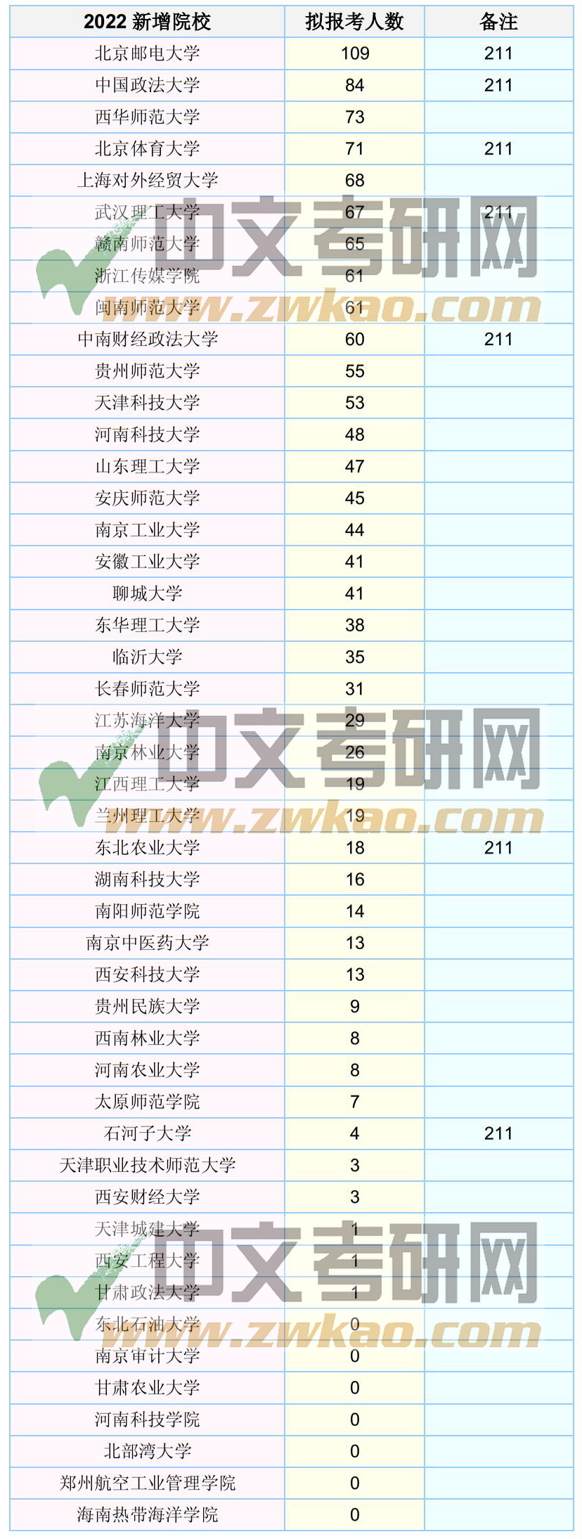 剔除重复用户,每人只计一次,例如有人确定报考某校,则在该校下计为1人,如有人在n所学校(可能都是新增院校,也可能既有新增院校,又有非新增院校)中犹豫不决,则其中的新增学校每校按1/n人计,例如某人打算在“北京大学”“北京邮电大学”“北京体育大学”三校选择其一报考,则其中属于新增院校的北京邮电大学、北京体育大学各计1/3,以此类推。还有相当多的人不是很想以新增院校作为第一志愿,但希望在调剂时调剂到新增院校,这种情况暂按1/10计。表格中的拟报考人数为根据上述方法计算的报考该校总人数经四舍五入而得,因此是估算数据,而非实际报考数据,且目前距离考研报名结束尚有两个月,将与最终报考人数(即完成报名、交费且通过网上确认的人数)有一定误差。