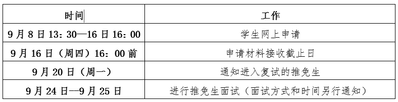 进入复试的推免生于9月24日—9月25日参加面试(各专业具体时间另行通知)。面试满分为70分。面试内容为本专业相关问题。面试由各专业(教研室)组织。