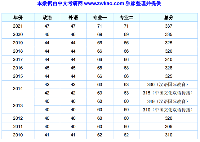中国传媒大学汉语国际教育硕士2010-2021年复试分数线