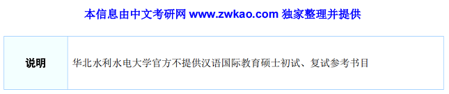 中文考研网向报考华北水利水电大学汉语国际教育硕士的同学免费赠送华北水利水电大学汉语国际教育硕士完整版真题等多种资料,请您到中文考研网精品资料栏目(网址:http://www.zwkao.com/jpzl.html)申请会员和领取资料。