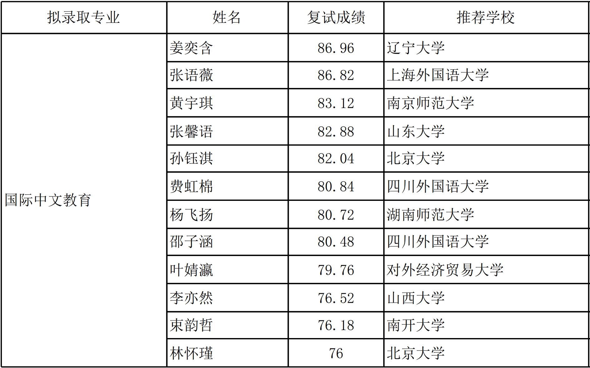 经北京大学研究生院审核,2024年接收推荐免试国际中文教育硕士研究生拟录取名单见附件。