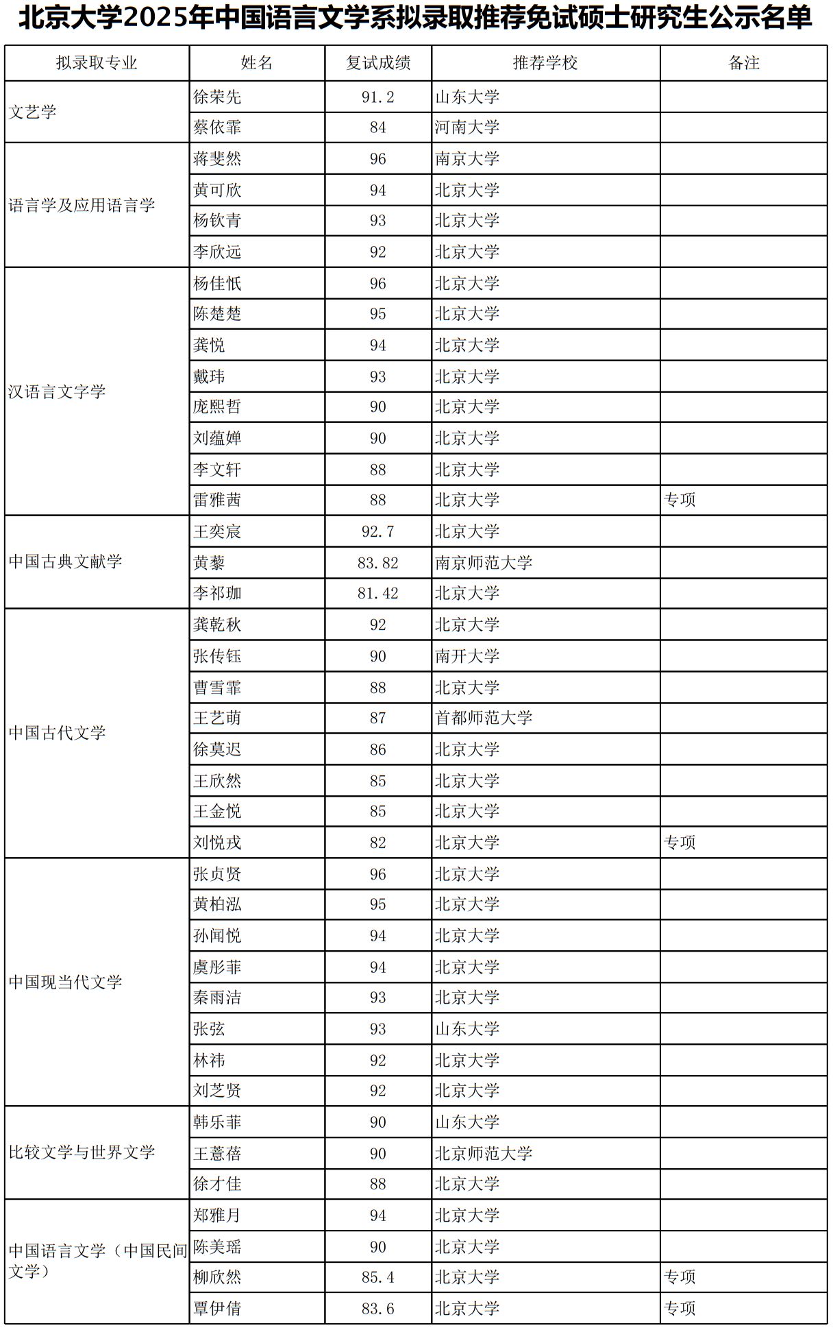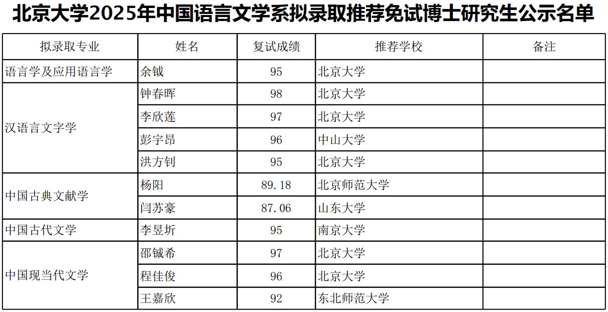 附件1:北京大学2025年中国语言文学系拟录取推荐免试硕士研究生公示名单
