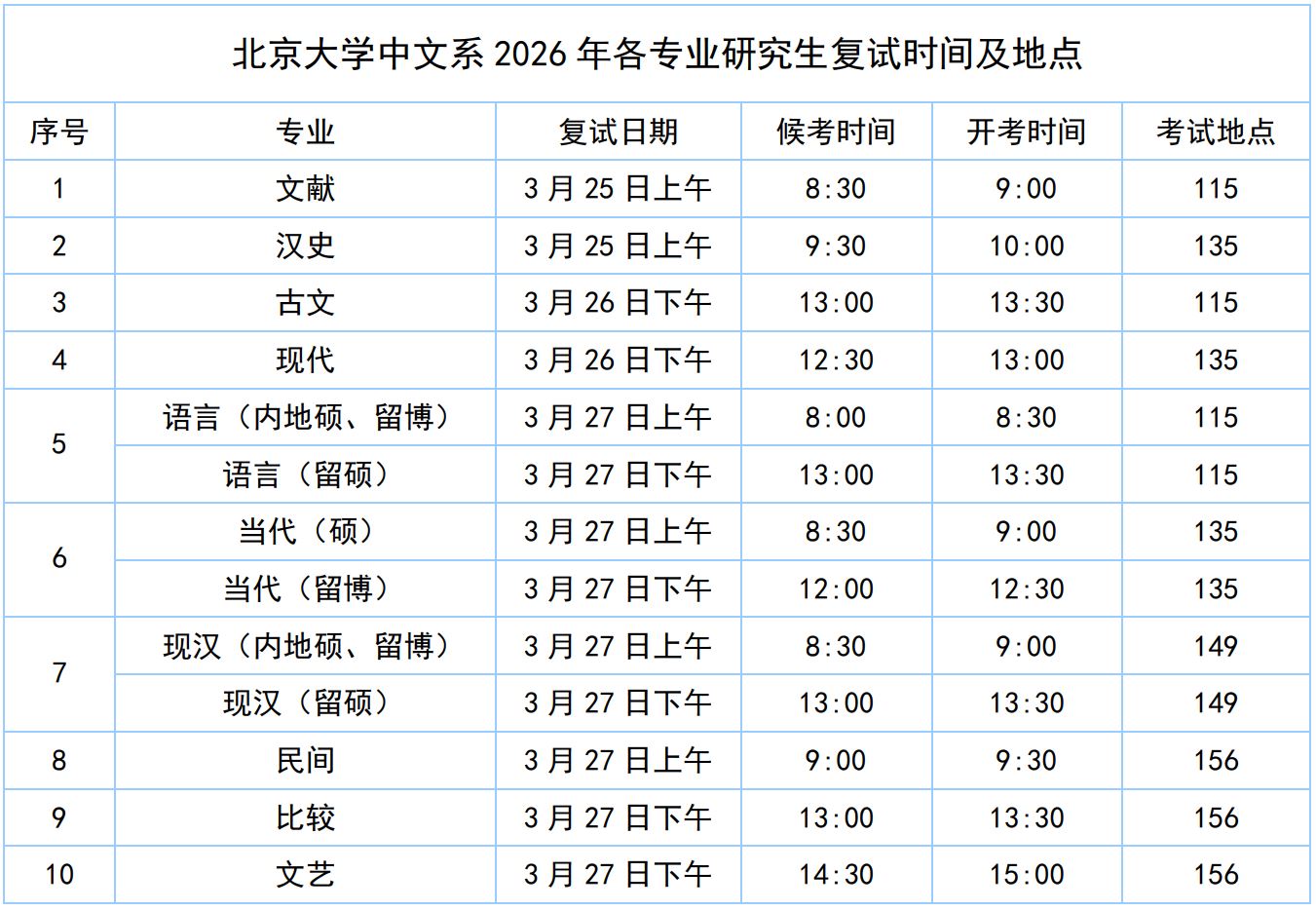2.各专业复试安排如下(考试地点均在北京大学人文学苑6号楼会议室):
