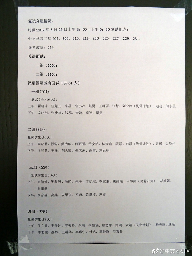 文华厅张贴的复试名单